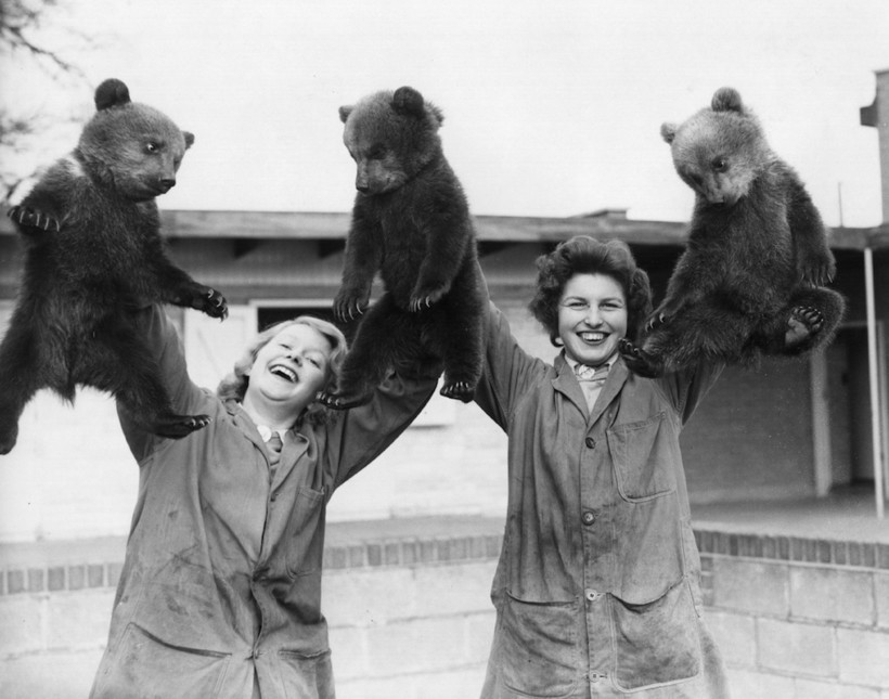 Маленькие бурые медвежата впервые вышли на люди. Уипснейдский зоопарк, Англия, 1959 г.