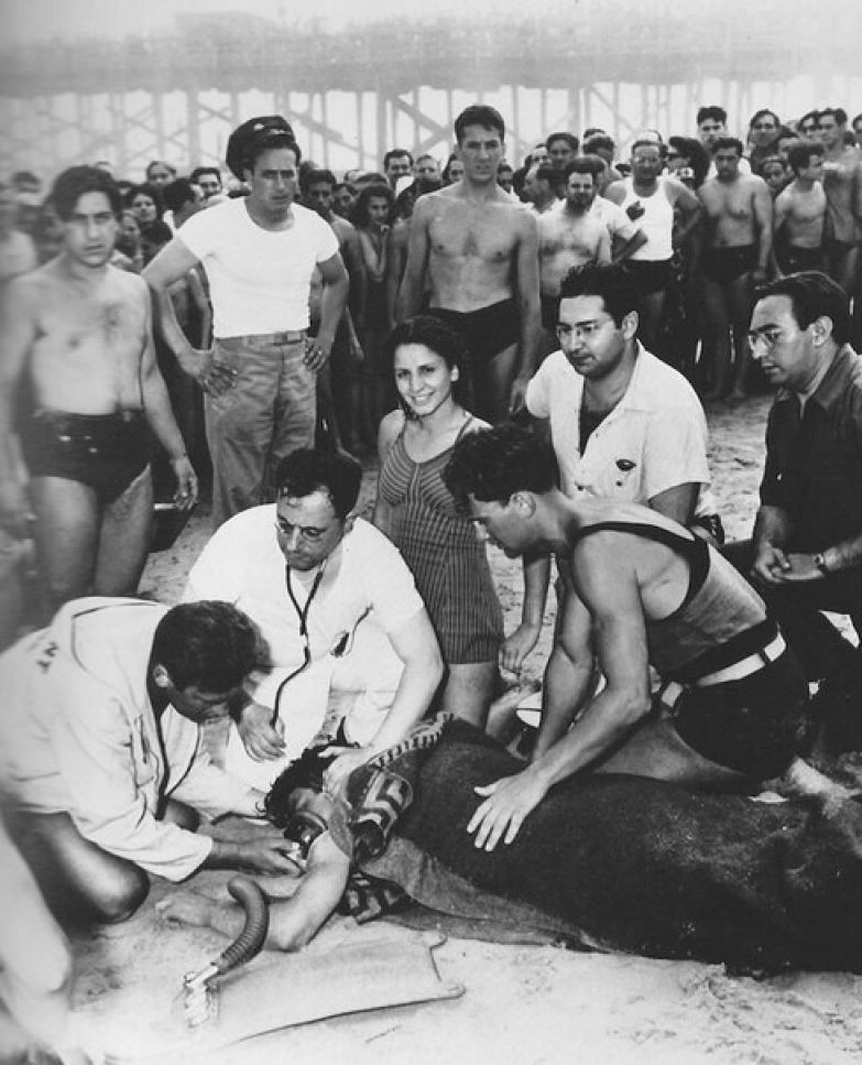 Девушка в купальнике позирует для фото в то время, когда врачи делают искусственное дыхание утопленнику, 1940 г.