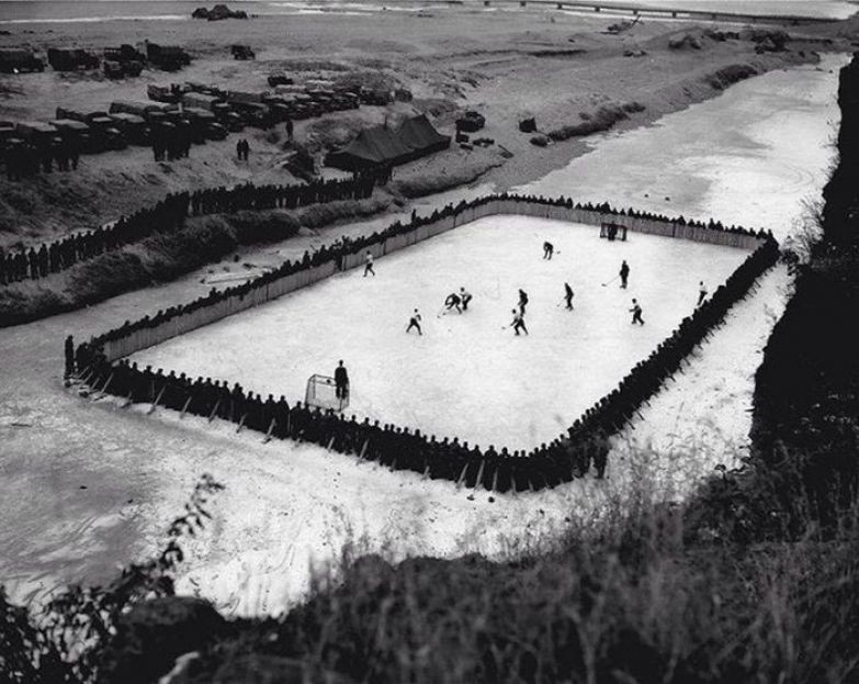 Солдаты из Канады во время службы в Корее соорудили импровизированную площадку для игры в хоккей, 1952 г.