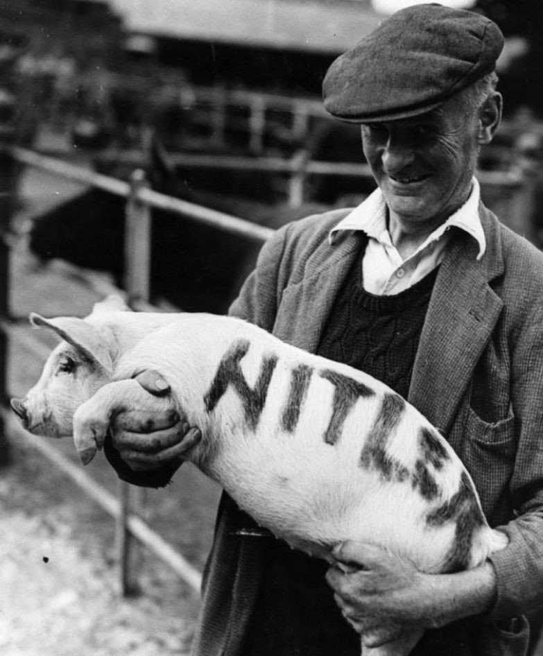 Фермер с поросенком в руках. Поросенка он назвал Гитлером, так как тот пытался оттеснить от кормушки других животных и забрать себе всю еду. Пришлось отселить негодяя, 1942 г.