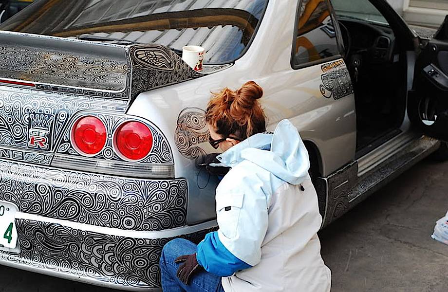 Американская семья решила придать своему невзрачному автомобилю Nissan Skyline GTR индивидуальности и разрисовала его маркером. Однажды вечером глава семьи позволил жене закрасить несколько царапин на бампере, но был настолько поражен элегантным рисунком, что решился разрисовать автомобиль полностью!