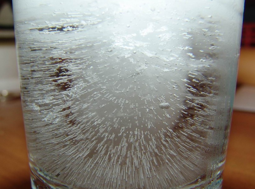 Но что же происходит, когда мы достаем бутылку из холода? Как показано на видео, экспериментатор встряхивает бутылку или прикасается к воде кусочком льда. От механического воздействия или соприкосновения с кристаллами льда переохлажденная вода начинает прямо на глазах превращаться в лед. Вода обретает тот самый недостающий центр кристаллизации и, поскольку ее температура значительно ниже нуля градусов, запускается цепная реакция — кристаллики льда пристраиваются друг к другу и постепенно заполняют собой весь объем бутылки.