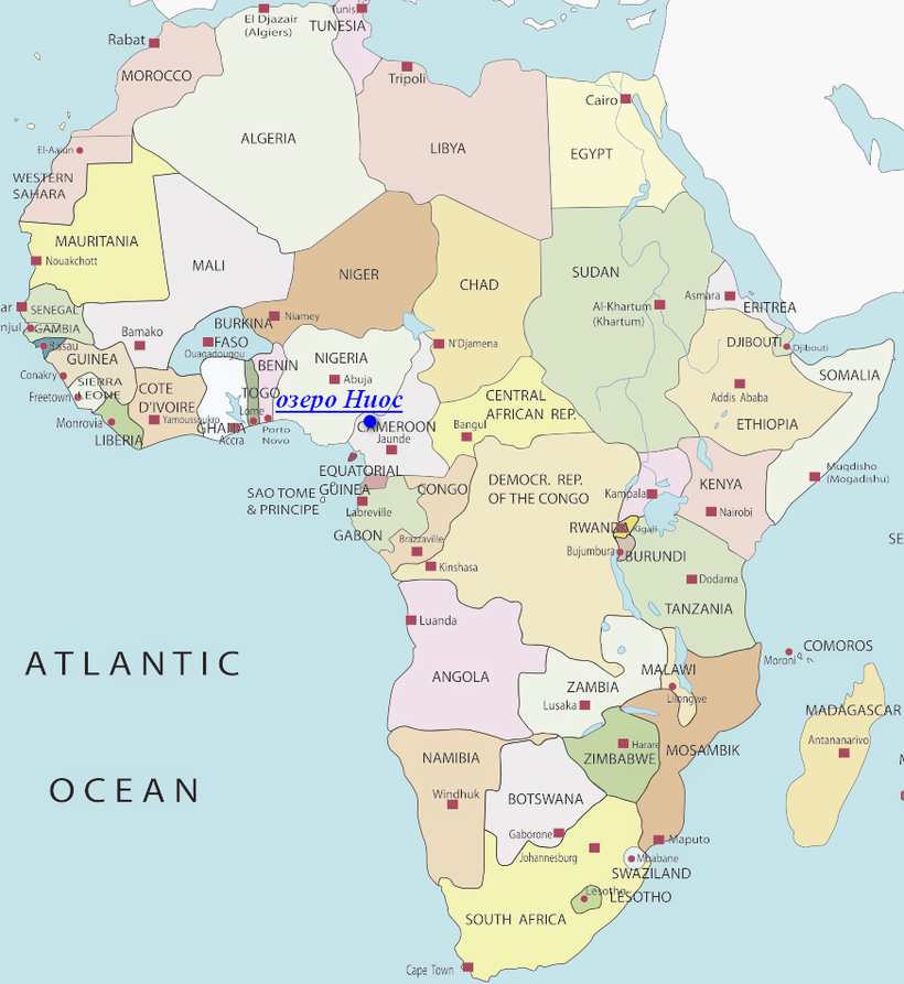 Озеро Ниос (также Ньос) расположено в Камеруне (Центральная Африка), недалеко от границы с Нигерией. Глубина озера довольно внушительная — 209 метров, а его площадь — около 1,6 кв. км. Как предполагают исследователи, это высокогорное озеро образовалось в провалившемся кратере потухшего вулкана, который был заполнен поверхностными и подземными водами около 400 лет назад. Именно с вулканическим происхождением озера связаны ужасные события, которые привели к гибели более 1700 человек и нескольких тысяч животных.