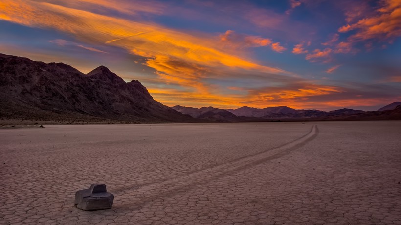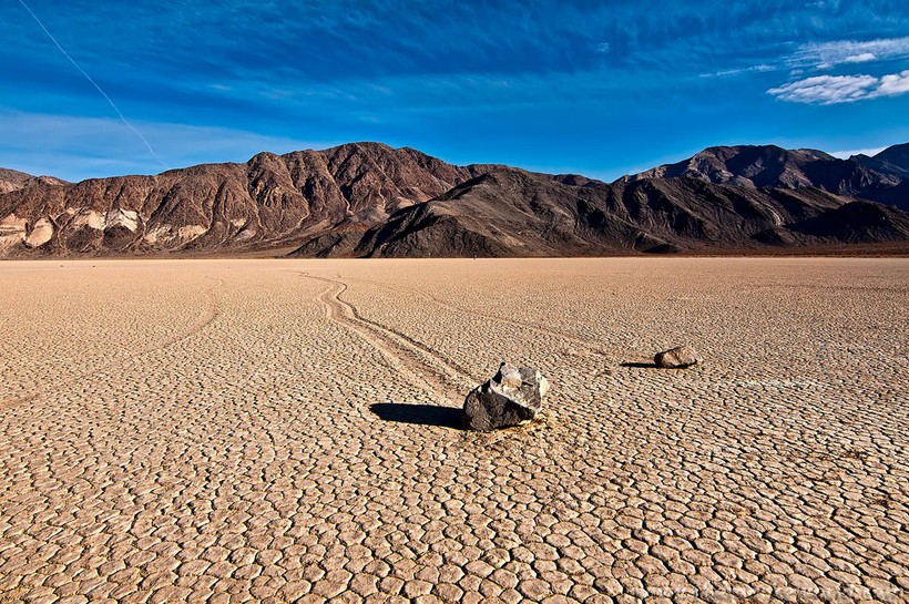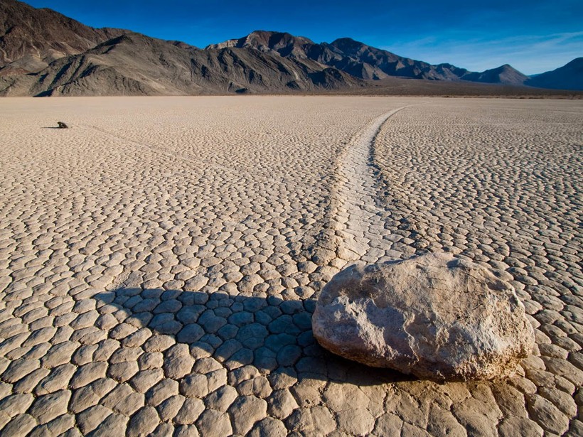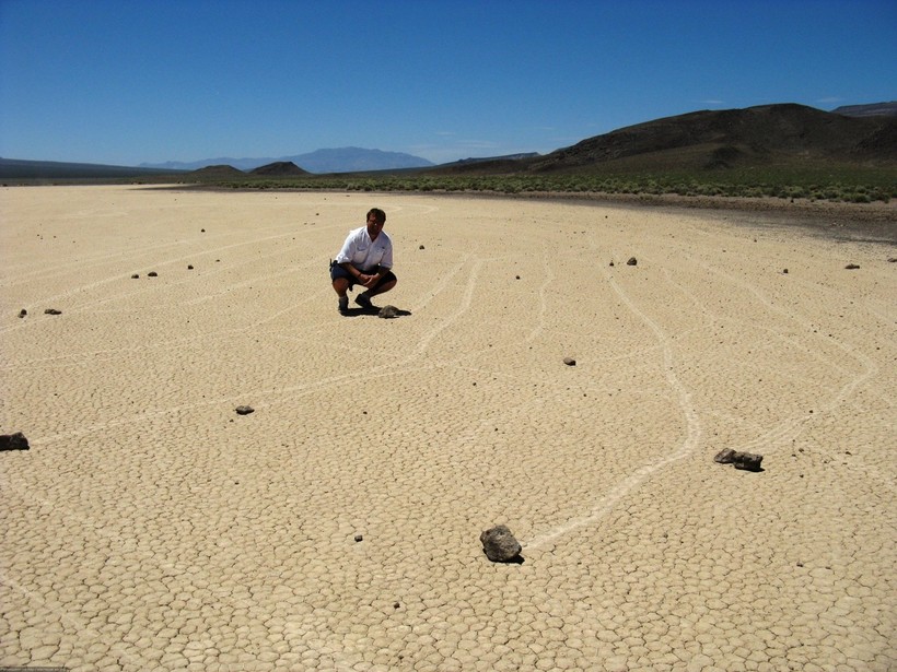 Долина Смерти в США известна не только как одна из самых жарких пустынных долин на Земле, но и как место, где перемещаются таинственные камни весом до 300 килограммов. Камни медленно двигаются по глинистому дну высохшего озера Рейстрэк-Плайя, о чем свидетельствуют длинные следы, тянущиеся за ними.