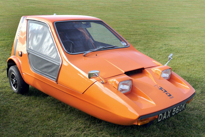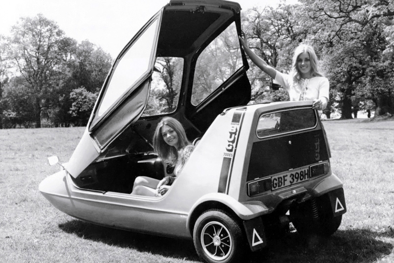 Bond Bug 700E — еще одна забавная трехколесная модель родом из Великобритании. Было продано чуть более двух тысяч автомобилей. Скромные габариты и достаточно сложный вход: дверь, по сути, — это вся верхняя часть кузова. Несмотря на свои крохотные размеры, машина может развивать скорость до 123 километров в час. У Bond Bug 700E и сегодня есть поклонники.