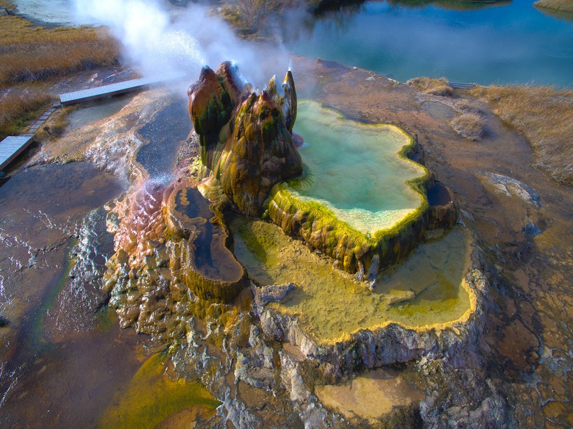 Удивительное творение природы носит поэтическое название — гейзер Флай. Происхождение этого феномена довольно интересно. Дело в том, что на начальном этапе формирования к его появлению были причастны люди. В 1916 году при бурении скважины рабочие задели пласт подземных геотермальных вод, которые долгое время никак себя не проявляли. Пока в 1960-х годах минеральная кипящая вода не начала выходить на поверхность, образуя необычный ландшафт.
