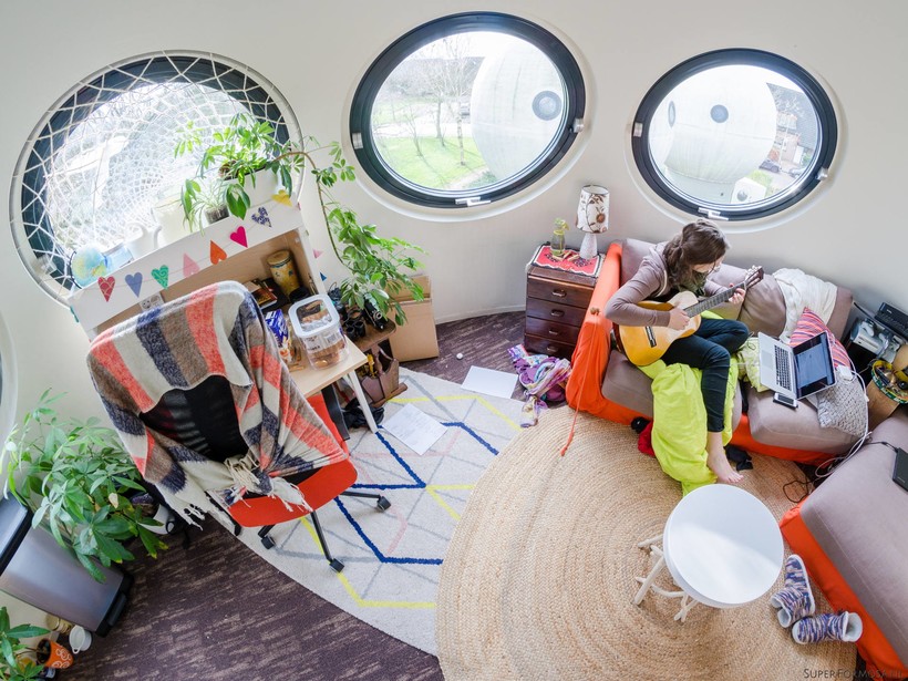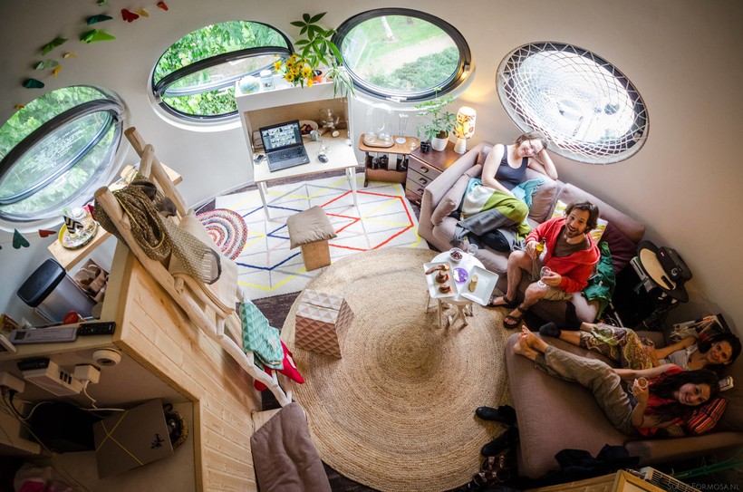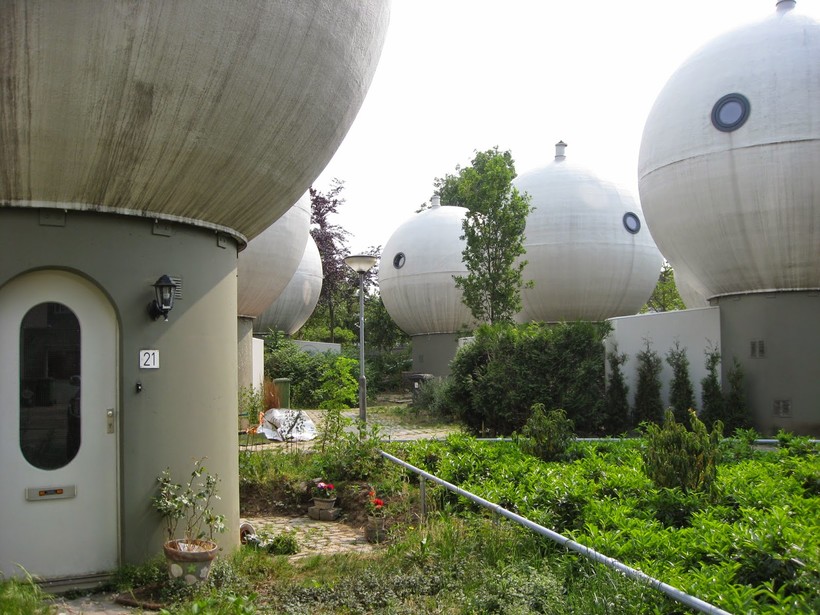 Каждый дом установлен на цилиндрическое основание, сделан из цемента и армирован стекловолокном. Необычное жилье диаметром 5,5 метров, и в нем 11 круглых окон. Внешне эти шары больше похожи на какие-то хранилища, впрочем, внутри дома тоже необычны. В самом центре здания находится маленькая спальня и ванная комната, есть и второй этаж, где расположились кухня и гостиная.