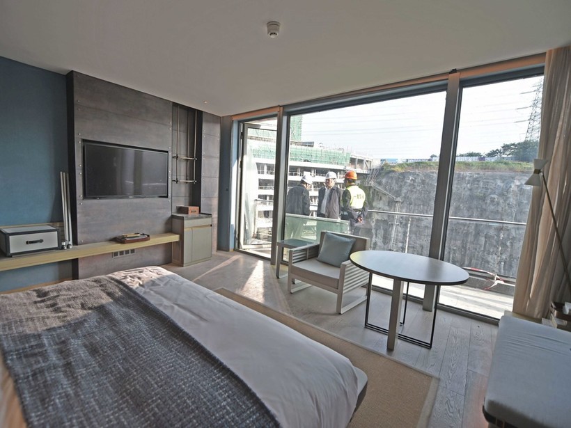 В подземном отеле будет 370 номеров, просторные общественные зоны и конференц-залы, вместимостью до 1000 человек. Songjiang InterContinental Hotel позиционируют как спортивный и развлекательный Spa-курорт. Гостям предложат заняться скалолазанием или прыгнуть с банджи. Изюминкой отеля станет водопад, который будет стекать с самой высокой точки карьера прямо в центре здания.