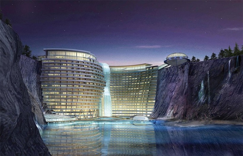 Отель строят в заброшенном карьере, глубиной 90 метров. Предполагается, что на поверхности земли будет всего два этажа. Основная часть здания займет пространство внутри карьера, а два этажа и вовсе сделают подводными. Там будет несколько люксовых номеров для гостей, ресторан и аквариум глубиной 10 метров.