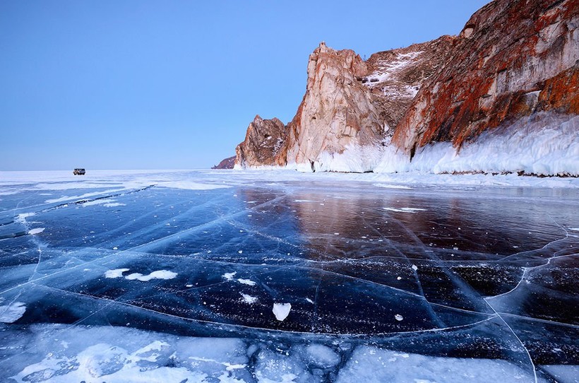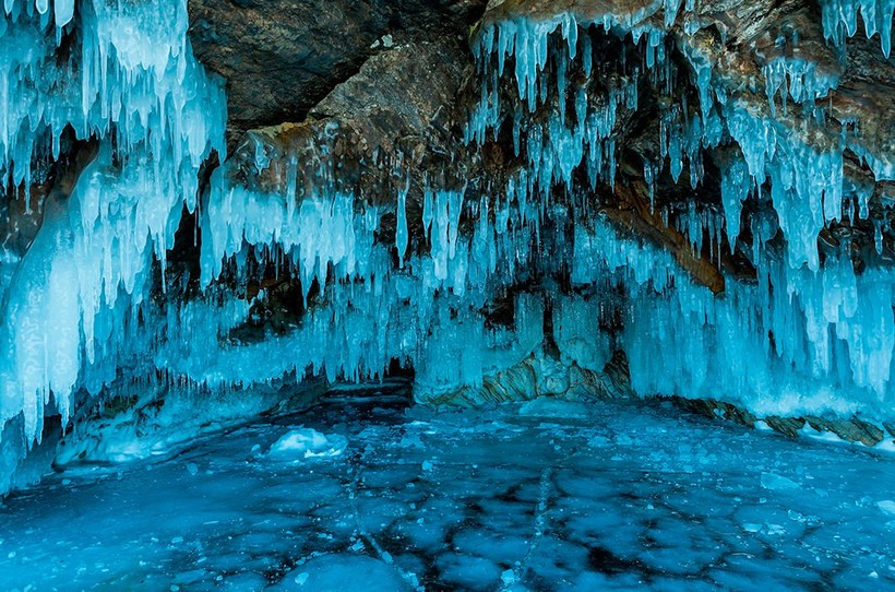 Пещера с ледяными сталактитами на острове Ольхон, Байкал