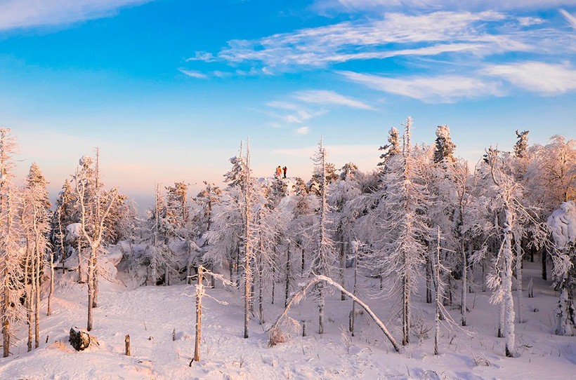 Заснеженный лес и двое на скале, Нижний Тагил, Свердловская область