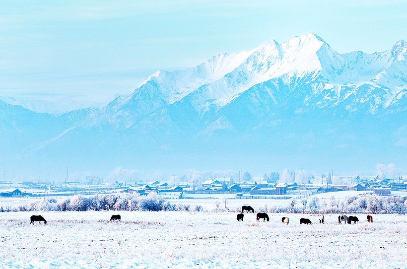 Величественные Восточные Саяны и пасущиеся на их фоне лошади