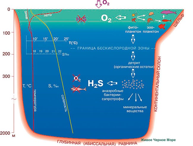 Черное море отличается очень интересной структурой. Дело в том, что толща воды в нем делится на несколько слоев, которые не перемешиваются между собой. Тонкий поверхностный слой моря более пресный, он богат кислородом и органическими веществами. Именно здесь сосредоточено все разнообразие черноморской фауны. Но, начиная с глубины 100 метров, происходит снижение количества растворенного кислорода, и примерно с глубины 200 метров Черное море представляет собой токсичную сероводородную среду.