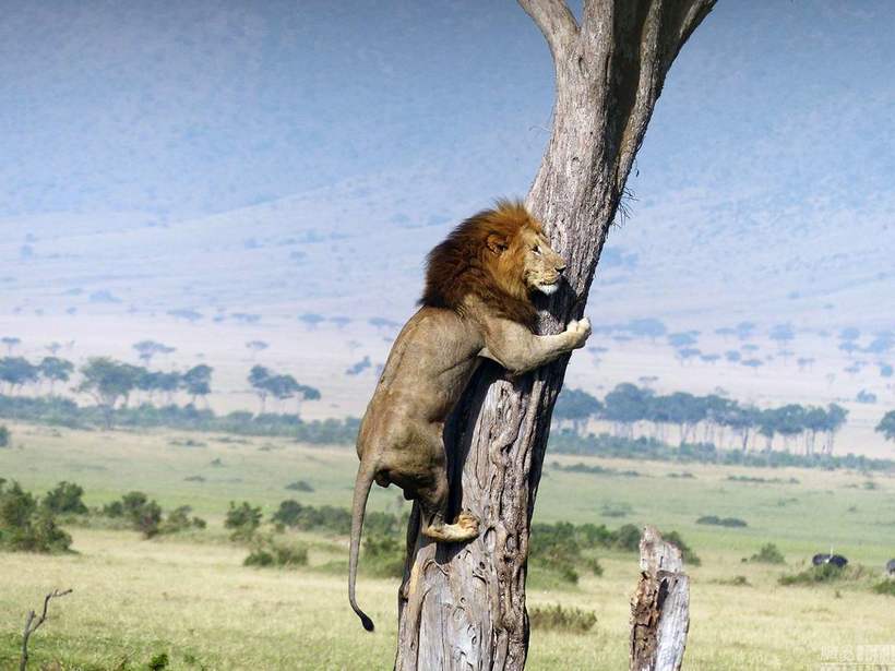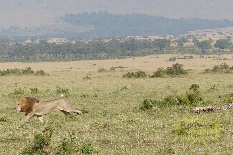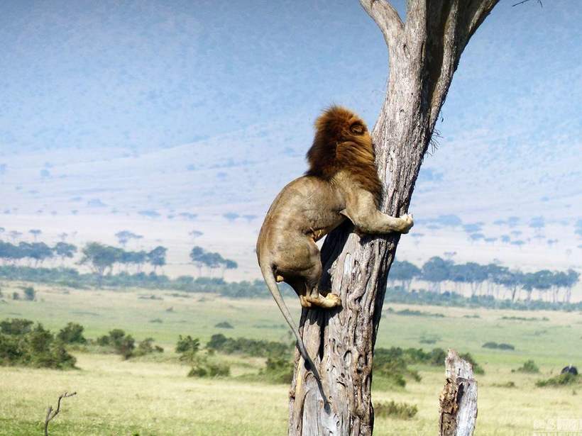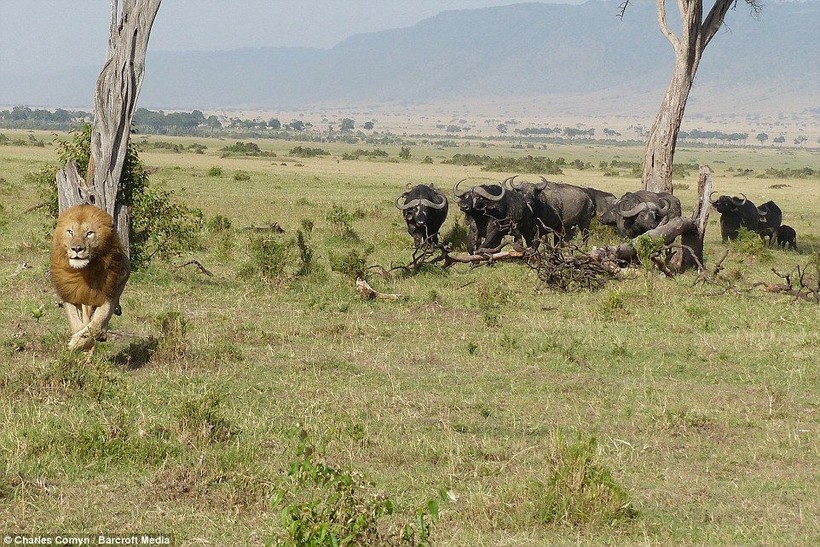 Супруги Коман путешествовали по одному из самых крупных и впечатляющих заповедников дикой природы, Масаи-Мара, расположенному в Кении, когда стали свидетелями необычного и любопытного зрелища. Лев, который несколькими минутами ранее, по всей видимости, затаился в высокой траве, чтобы напасть на детеныша буйвола, сейчас в ужасе пытался вскарабкаться на дерево, спасаясь от нагрянувшего стада взрослых буйволов.