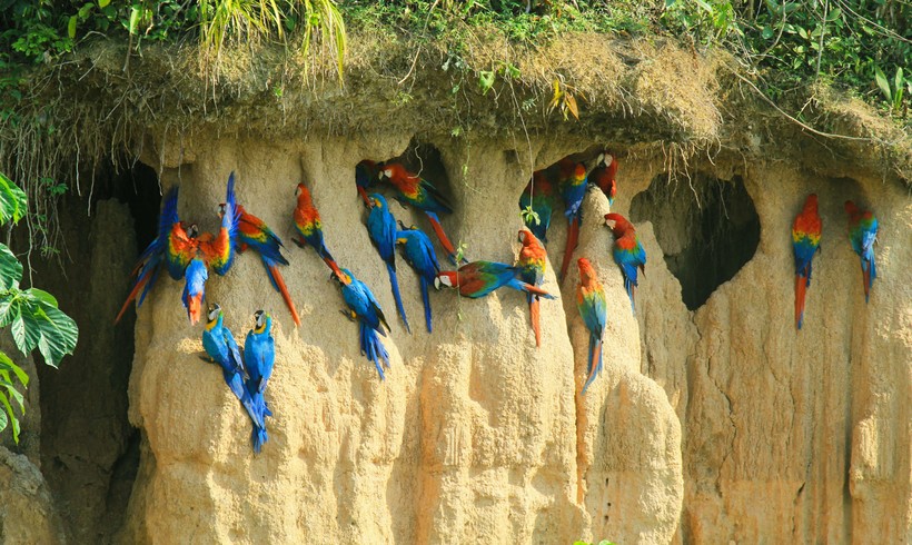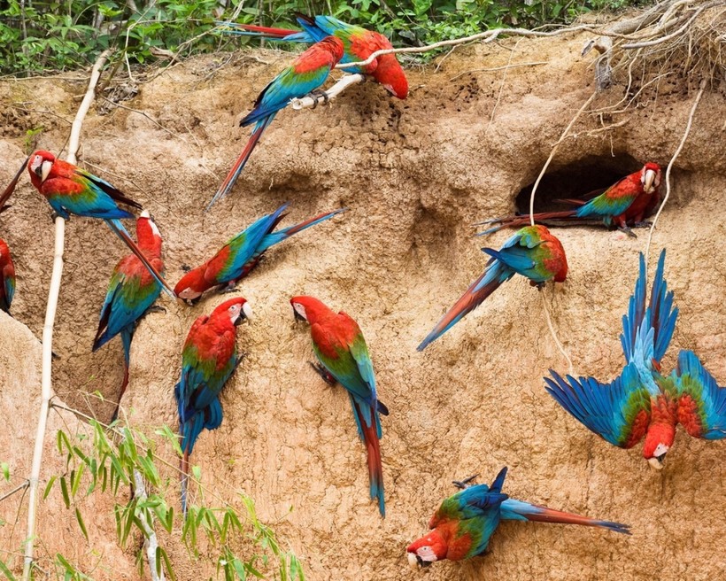 На высоких обрывистых берегах рек Южной Америки можно увидеть необычную картину. Десятки яркоокрашенных попугаев ара, уцепившись когтями за отвесный склон, старательно отщипывают кусочки грунта и едят его. Окрестные леса изобилуют фруктами и орехами, поэтому такие странные гастрономические пристрастия нельзя объяснить отсутствием пищи. Зачем же тогда эти красивые крупные попугаи каждое утро слетаются со всей округи на берег и поглощают свою порцию земли?