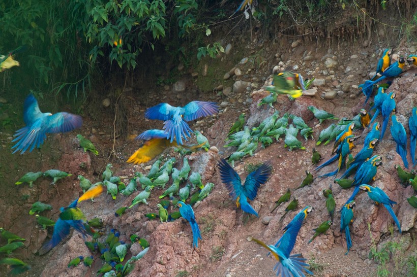 Интересно, что в подобном поведении были замечены не только попугаи ара, но и другие виды птиц: амазоны, пионусы, бротогерисы и аратинги. Кроме того, попугаи жако, обитающие в Африке, также включают в свой рацион кусочки земли, добытой ими в определенных местах. Как правило, это отвесные берега рек, сложенные глинистыми отложениями. Именно ради глины птицы, да и некоторые звери, приходят из близлежащих районов в места, где есть доступ к отложениям глины. На некоторых реках, как, например, на реке Тамбопата, протекающей по тропическим лесам Перу, можно одновременно наблюдать более 1000 птиц.