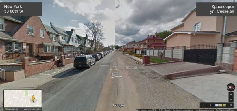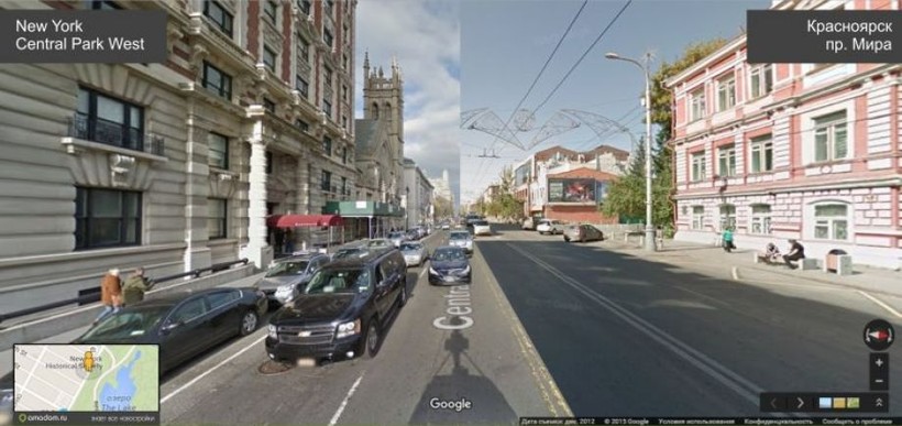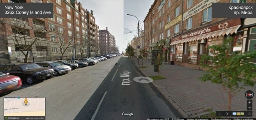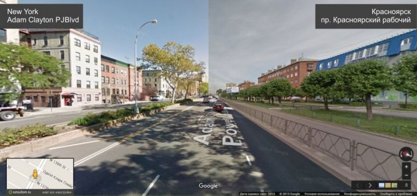 Однако сотрудники портала недвижимости кое-что все-таки нашли — дату основания. Нью-Йорк был основан в 1624, а Красноярск появился спустя 4 года, в 1628-м. Тогда люди ради эксперимента решили проанализировать панорамы Гугла и сравнить архитектуру двух городов. Вот здесь-то и крылось нечто удивительное. Оказалось, что улицы этих городов необычайно похожи. Для наглядности они объединили на одном снимке две улицы: справа — улицу в Красноярске, а слева — улицу в Нью- Йорке. Взгляните сами, что получилось.
