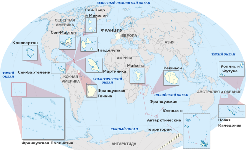 5. Тихий океан: территория островов Уоллис и Футуна, Новая Каледония, Французская Полинезия с населением около 280 000 человек, остров Клиппертон.