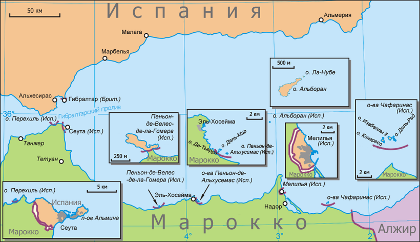 2. Средиземное море: города Сеута и Мелилья на средиземноморском побережье Африки, напротив Испании, которые имеют статус автономных городов, а также острова Алусемас, Чафаринас, Перехиль, Альборан.