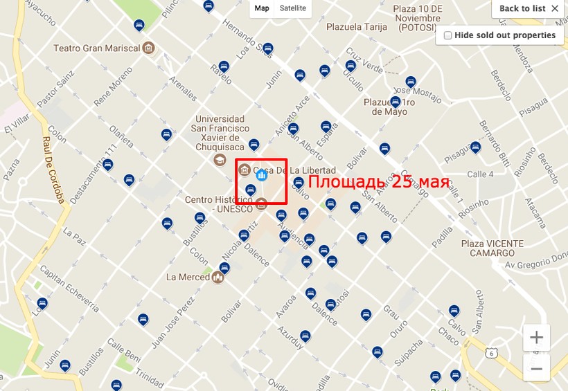 Центр Сукре – Площадь 25 мая, от нее расходятся все улицы. Поэтому чем дальше от площади, тем дальше от людей и веселых заведений. В Сукре много хостелов, потому что много студентов и туристов «бэкпекеров». Кровать в общей комнате стоит от 5 USD. Скромный номер на двоих – от 15 USD. Хороший отель 4* – от 60 USD. Выбирать и бронировать жилье удобно на Букинге. Посмотреть цены на апартаменты можно тут, а сравнить стоимость номеров в гостиницах по этой ссылке.