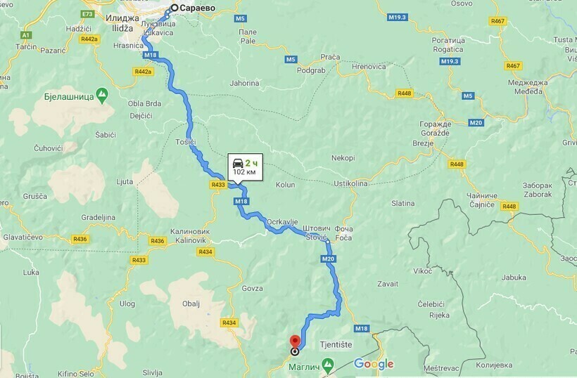 Путь от Сараева до подножья Маглича на автомобиле следующий: