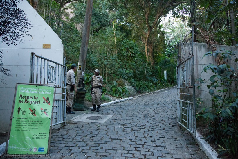 Итак, выходим из касс и идём по направлению к Сахарной голове (Pão de Açúcar). Слева проходим белое здание и выходим к воротам с охраной. Это вход на тропу. Здесь можно увидеть людей на пробежке. Первые десять минут идти очень легко, слышен шум прибоя на Красном пляже (Praia Vermelha), где можно покупаться после спуска, так что не забудьте прихватить купальник. Затем, полюбовавшись мартышками, которых нельзя кормить, вверх влево идёт наша дорога по лесу. Идти минут 25. Людям, не любящим спорт, подниматься будет тяжеловато, хотя второй раз со мной поднимался мой знакомый, которому за 60 лет. Можно останавливаться на смотровых площадках. Путь разделен на 5 остановок.