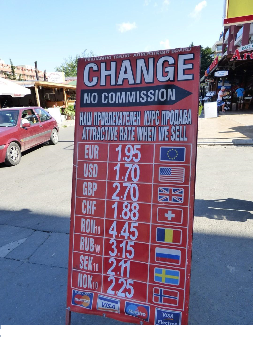 Поэтому совет с валютой туристам может быть только такой: если вы впервые едете Болгарию, особенно на крупный курорт, и у вас в запасе нет болгарских левов, подготовьте заранее мелкие купюры номиналом в 5, 10, 20 €, тогда при обмене в первом попавшемся на пути пунктом (поверьте, вряд ли это будет выгодный курс) ваши потери будут минимальны. Добравшись до места назначения, найдите банк с оптимальным курсом и там меняйте основную сумму. И будет вам счастье!