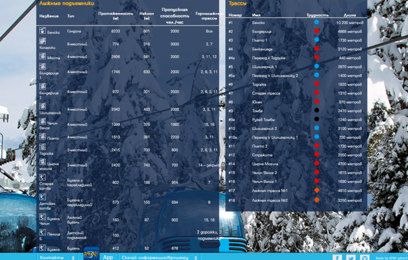 Горнолыжный отдых, безусловно, является первой причиной поездки в Банско с середины декабря по апрель. Подъемники работают с 8.30 до 16.30–16.45, в зависимости от их близости к вершине. Гондольный подъемник доставляет туристов до «Бандеришка-Поляна». Арендовать снаряжение или взять инструктора можно на ней же. На учебных трассах ленточные и бугельные подъемники. К вершинам же идут кресельные подъемники.
