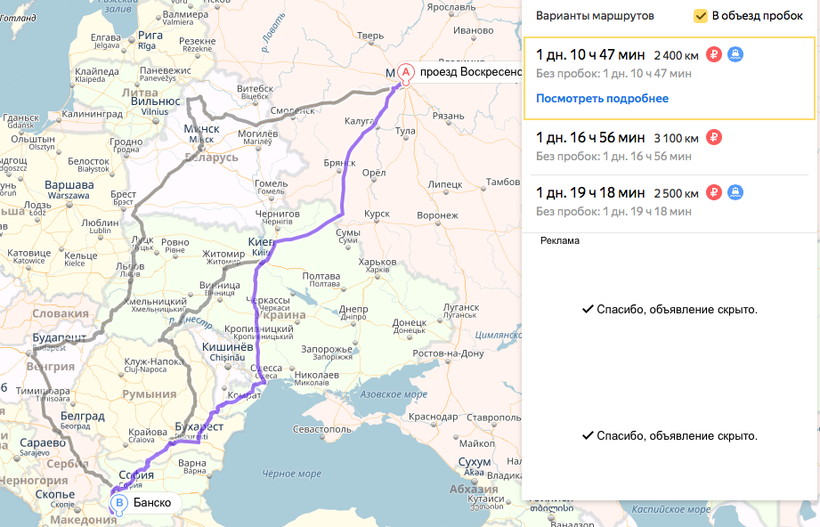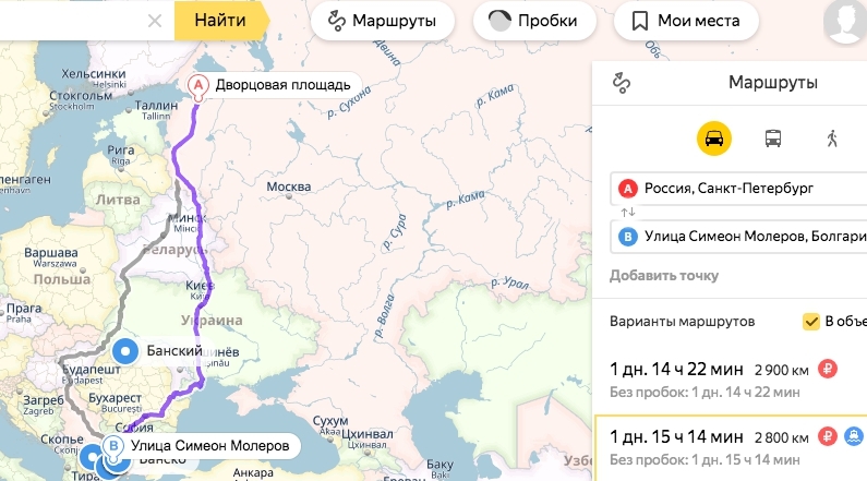 Кратчайший путь из Санкт-Петербурга в Банско тоже проходит через Украину с переправой в Никополе и через реку Днепр и составляет 2 800 километров, что эквивалентно 1 дню и 15 часам без пробок.