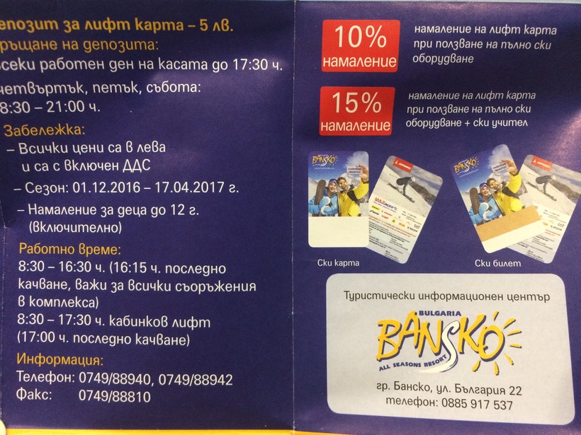 Цены на ски-пассы в Банско совсем не высоки. Приобрести пассы можно в кассах курорта у подъемников. В 2017 году проход на день стоил меньше 30 EUR. В залог обычно берут 2,6 EUR, получить которые можно, сдав ски-пасс в конце поездки в специальный аппарат рядом с кассами. Ски-пассы на один подъем не продаются. Подняться вверх, посмотреть на горы и спуститься обратно будет стоит 14 EUR.
