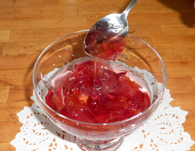 Что касается его вкуса и запаха, джем очень сладкий, но мало того, что он до тошноты приторный, он еще вдобавок пахнет парфюмерией, конечно, не духами, а как бы розами, но у меня этот запах совершенно никаким образом не связан с едой. Я даже не скажу, что он пахнет именно свежими розами, скорее это запах таких уже немного увядших лепестков роз.
