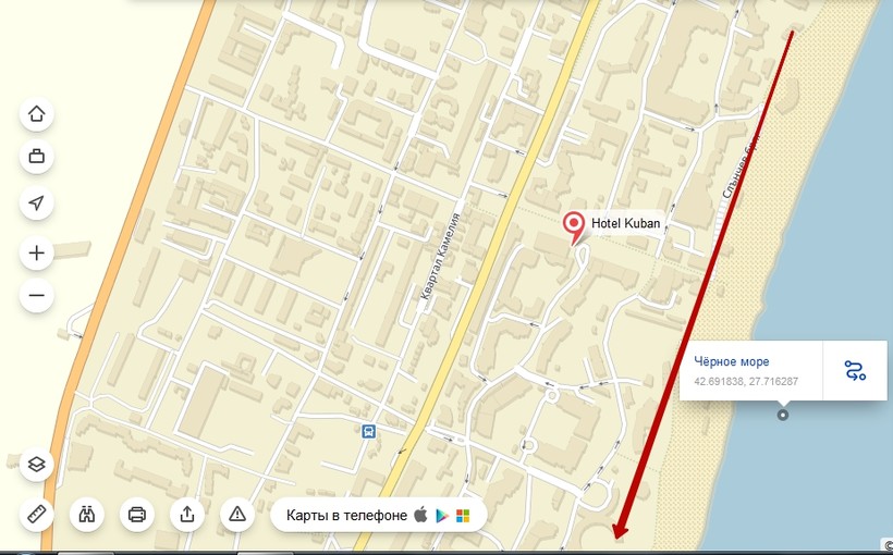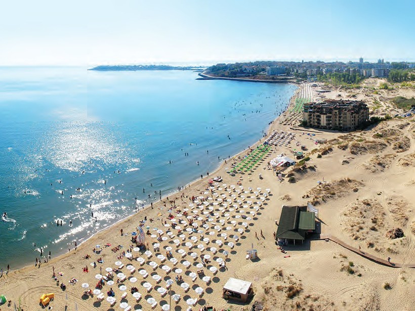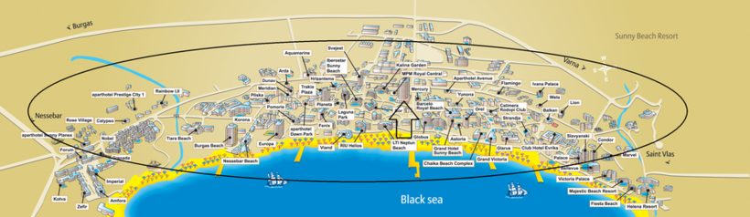 Взглянув на Солнечный Берег с высоты птичьего полёта, вы увидите, что с северной стороны он граничит с курортным городом Святой Влас, а с южной примыкает к новой части города Несебр.