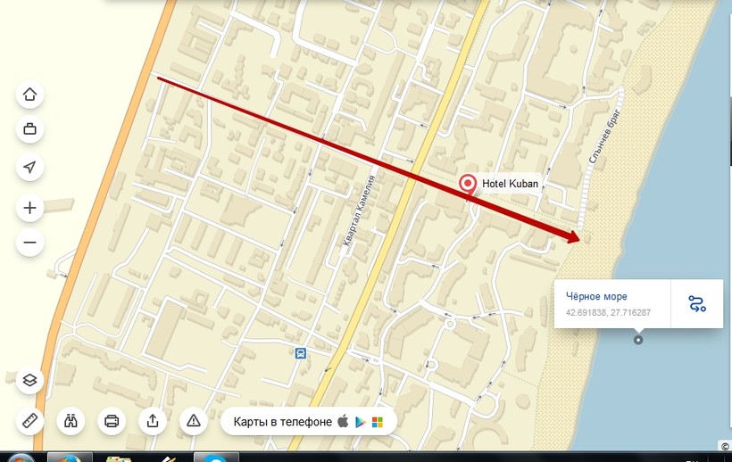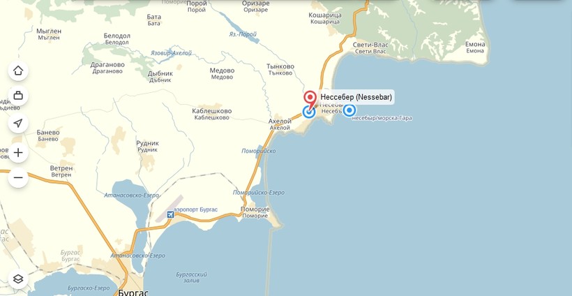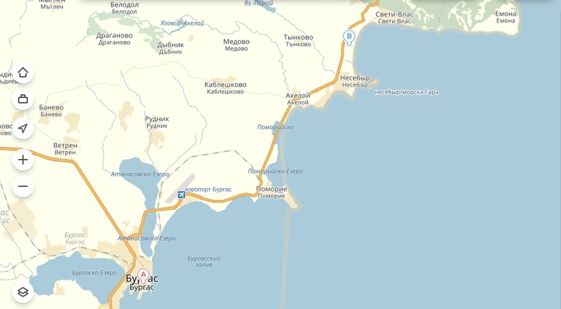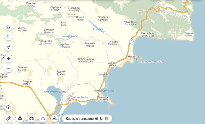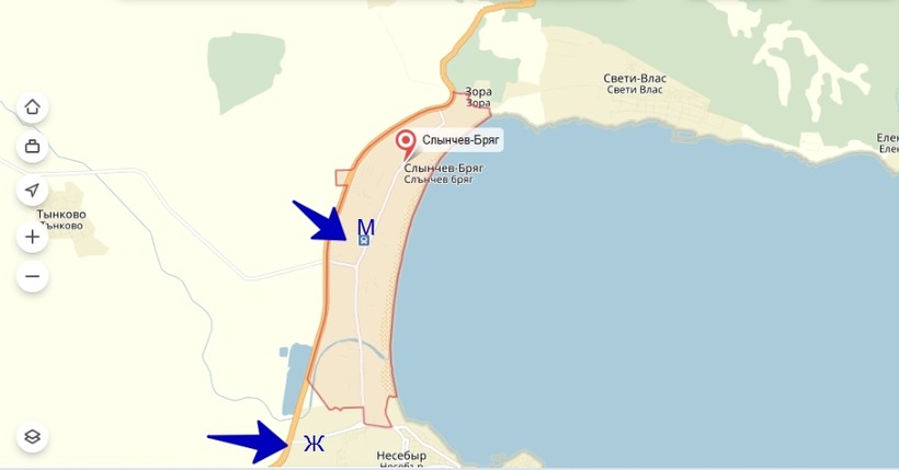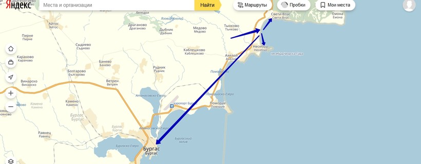 По карте видно, что территориально Солнечный Берег расположен между двумя крупными городами Юго-Восточного побережья, имеющими международные аэропорты: Бургасом и Варной.