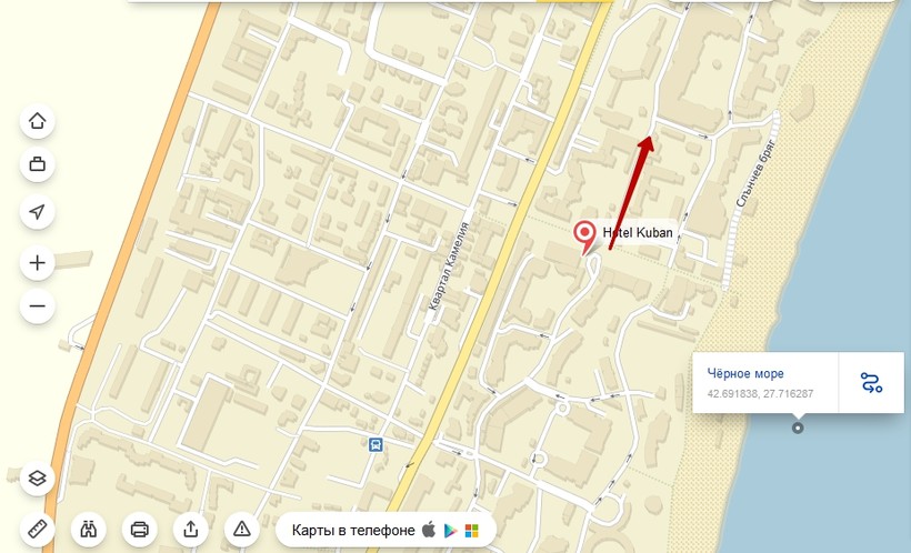 - Первая линия моря. Это сотни шикарных отелей, большинство из которых не ниже 4*. В моей классификации это «зона тусовщиков». На приведённой карте все гостиницы, располагающиеся от линии моря до центральной улицы.