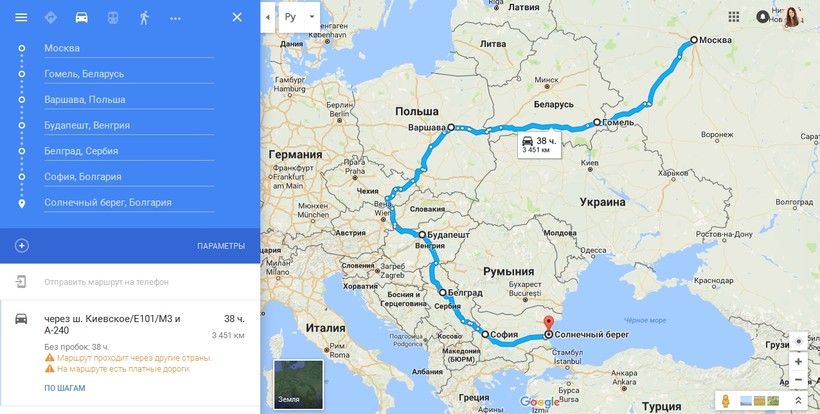 Москва — Гомель — Варшава (Краков) — Будапешт — Белград — София — Солнечный Берег. Такой путь имеет протяженность порядка 3 400 километров.