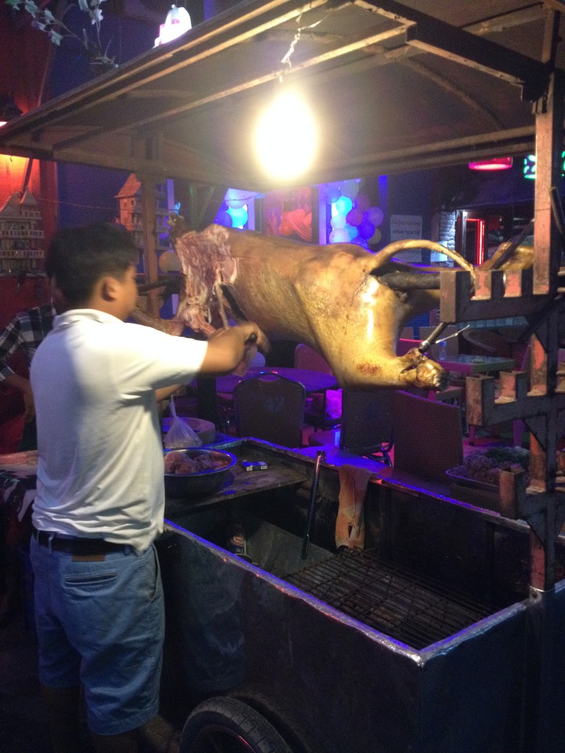 Ряды стоят квадратом, а в центре большая площадь. Прямо на асфальте лежат циновки, в центре которых соусы и специи. Покупаешь еду и напитки и садишься на циновки есть. Там же стоит импровизированная сцена на которой выступают местные ВИА. Еще здесь продают свежие фрукты/овощи, зеленушку всякую, морепродукты. Если снимаете квартиру, в которой есть кухня, купите здесь продуктов и приготовьте ужин самостоятельно – будет и дешево, вкусно.