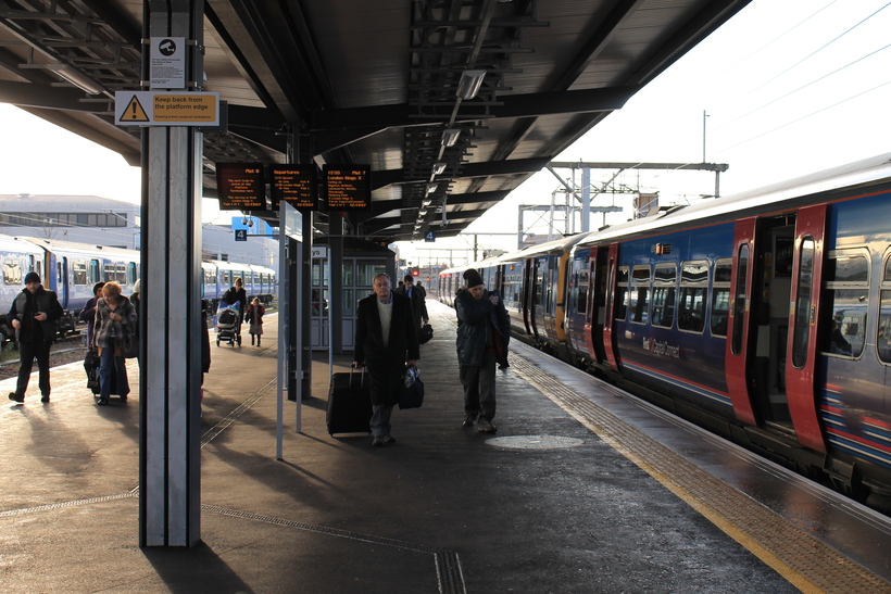 На поезда, которые едут на лондонскую Ливерпуль-стрит и обратно иногда можно приобрести билеты подешевле. Поездка занимает около 75 мин. Передвижение на поездах, которые едут по прямому маршруту от аэропорта Станстед занимает 35 минут (сядьте на любой поезд от станции Станстед и отправляйтесь в Бирменгем). Поскольку Кембридж находится на одном из главных стыков дорог в железнодорожной сети Восточной Англии, поезда также отправляются из Ипсвича, Норвича, Питерборо и Бирменгема.