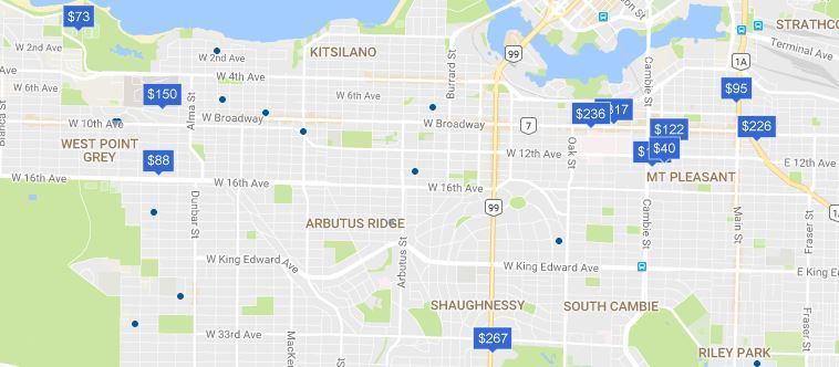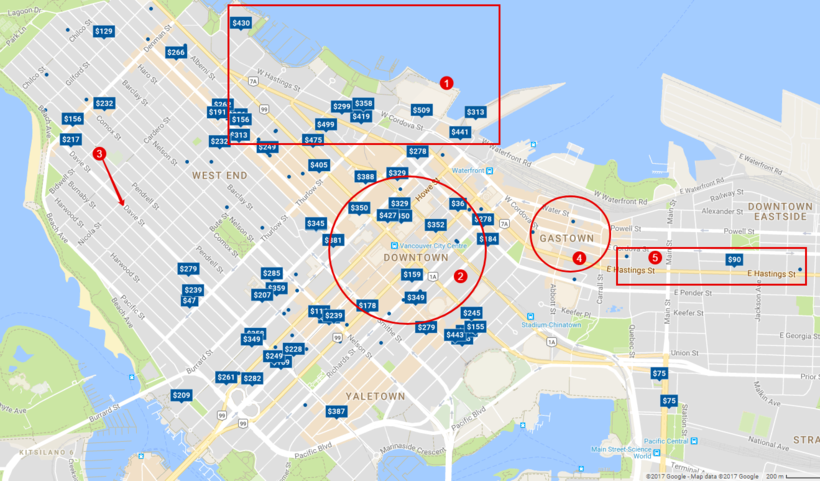 Это зависит исключительно от объема вашего кошелька. Разброс в ценах такой, что я даже не буду пытаться их как-то систематизировать. На этой картинке - даунтаун, то есть центр Ванкувера. Судите сами: