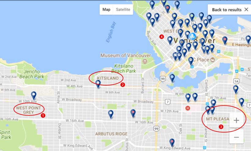Если вы не стремитесь в Даунтаун (цифра 4 на карте ниже), а предпочитаете тихие районы с красивыми частными домами с ухоженными садиками, поищите жилье в районах Point Grey (1), Kitsilano (2) или Mt. Pleasant (3).