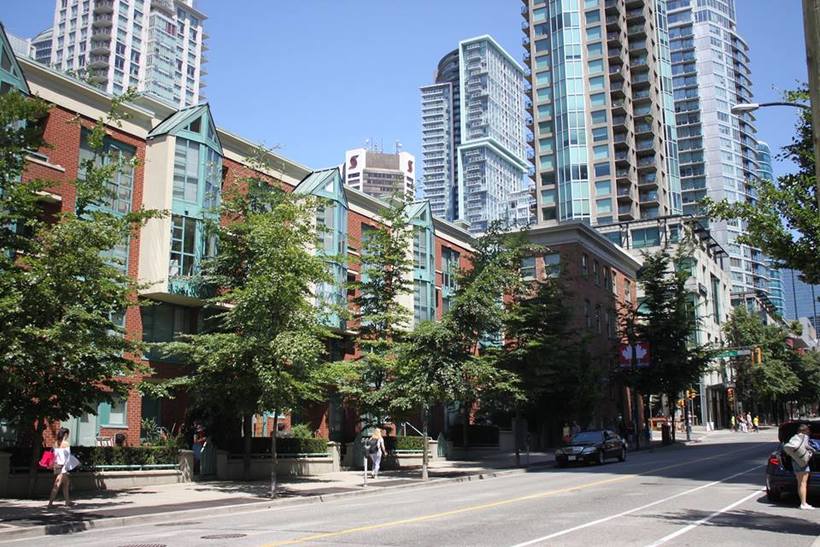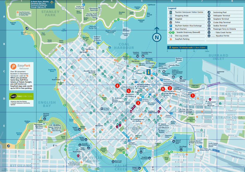 Даунтаун - это деловой и туристический центр города. Как вы можете увидеть на карте выше, он представляет собой условный полуостров. Шумный, оживленный, энергичный, говорящий на разных языках, переполненный людьми и транспортом, постоянно что-то празднующий. В нем узкие улицы и высокие дома, красивые фасады, но, кое-где и заплеванные тротуары. Здесь вы найдете развлечения, приключения, сможете погрузиться в ночную жизнь (хотя искушенная молодежь считает Ванкувер скучным и утверждает, что настоящая ночная жизнь здесь отсутствует). Не будучи экспертом в этой области, я, тем не менее, охотно верю этому утверждению. Ванкувер — это скорее город немолодых, сказочно богатых снобов, а «золотая молодежь» предпочитает тусить где-нибудь в Лас-Вегасе, Барселоне, Тель-Авиве или Нью Йорке. Вся ночная жизнь сконцентрирована в месте, обозначенном на карте кружочком под цифрой 2.