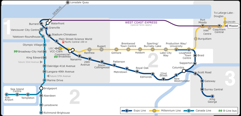 Линии Expo и Millennium отвечают за пассажиропоток из центра города (Даунтауна) в пригороды Burnaby, New Westminster, Surrey и Coquitlam. Перед Олимпиадой 2010 года в эксплуатацию была запущена новая ветка Canada Line, ведущая в пригород Richmond, а также в аэропорт (YVR).