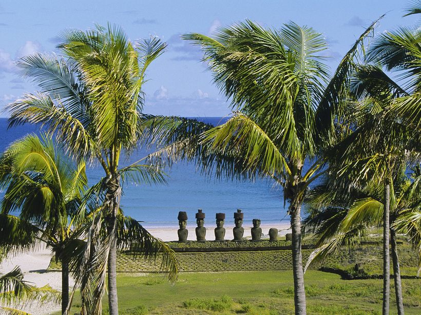 Самые большие достопримечательности на острове Пасхи - это фигуры стоящие на торжественных платформах, которые называются аху, моаи.