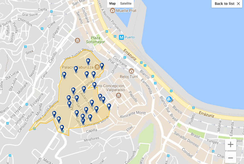 В Вальпараисо нет главных улиц и проспектов. Это лабиринт ступенчатых кривых сказочных переулков. Поэтому выстроить рациональный маршрут крайне сложно, ноги сами приведут вас куда нужно. Тем не менее, постарайтесь не упустить следующие названия: