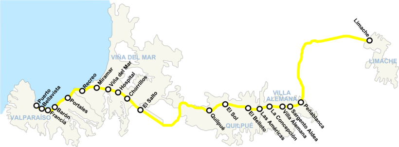 Недавно построенная линия метро Вальпараисо (здесь его называют Merval) проходит вдоль набережной города. По сути, это не метро, а пригородная электричка. Метро начинается в порту города и тянется в соседний курортный городок Винья-дель-Мар и дальше, в населенные пункты Кильпуэ, Вилья-Алемана, Лимаче. Часы работы с 6:00 утра до 23:30 вечера. Поезда курсируют каждые 5-10 минут в будние дни и каждые 15-20 минут в выходные и праздники.
