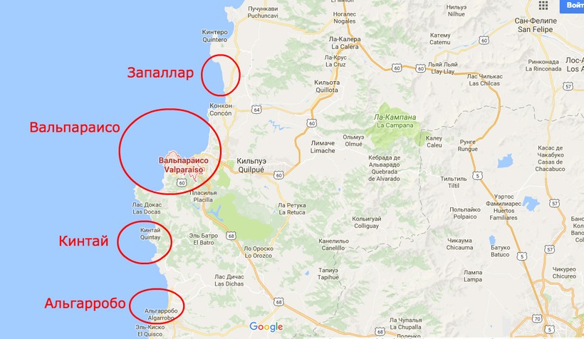 - Куинтай (Quintay), 45 км от Вальпараисо — совершенно идиллическая деревня к югу от города. Здесь нет высоких домов и ярких признаков цивилизации XXI века. Настоящее прибрежное безвременье: рыбацкие лодочки, маленькие симпатичные дома, чайки, волны бьются о камни. Добраться в Куинтай из Вальпараисо можно за 45 минут на такси. Стоимость — от 20 USD в одну сторону.