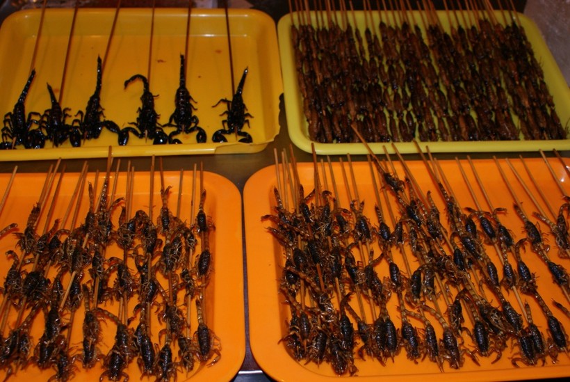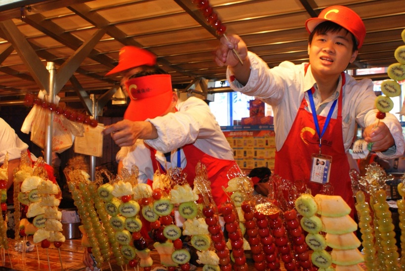 Популярен в Пекине и стрит фуд, например, на Ванфуцзине. Я не большой экспериментатор, но фрукты в карамели очень люблю (и такие маленькие китайские яблочки). Запах стоит весьма специфический, но стоит там побывать и посмотреть как «на слабо» иностранцы уминают шелкопряда и скорпионов.