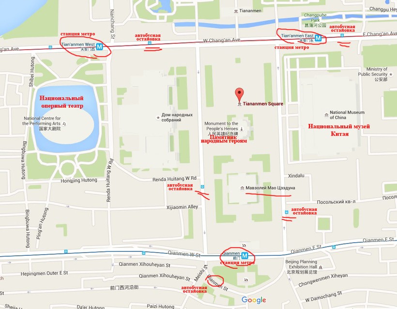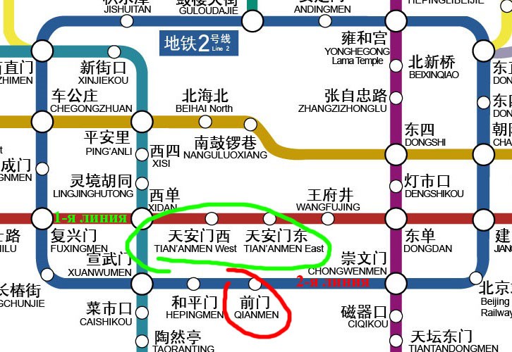 двери автобуса и опускаете монету или купюру в приемник. Сдача не предусмотрена, так что позаботьтесь о мелких наличных заранее. Обычно, если у меня вдруг нет мелочи, то я где-нибудь рядом с остановкой покупаю бутылочку воды. Она никогда не лишняя :) Остановки расположены от площади недалеко, вы не заблудитесь. - Метро. В Пекине я всегда езжу на метро и вам советую. Хоть и дороже автобуса в два раза (целых 2 юаня, меньше половины доллара :)) но зато быстрее! Нужные нам станции – Tiananmen dong и Tiananmen Xi (天安门东 и 天安门西) на 1 ветке и Qianmen (前门) на 2 кольцевой линии. Называются одинаково с автобусными :) Все просто!