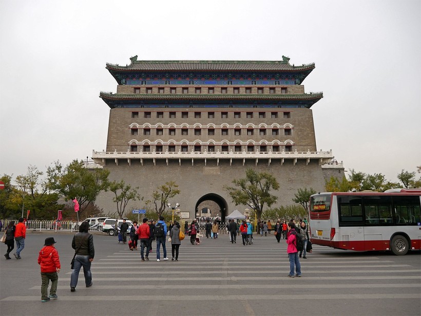 С юга располагаются ворота Чжэнянмэнь, которые в народе называются Цяньмэнь (Передние ворота). Просто ворота без стен, которые были снесены. Зачем тогда их оставили, ума не приложу :) Кстати, китайцы любили строить ворота и просто так. Даже на месте мавзолея раньше были похожие, имевшие только церемониальную функцию. Снесли...