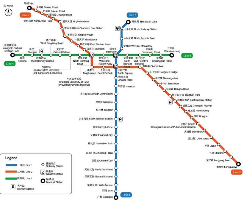 Метро в Чэнду появилось относительно недавно. Первая линия была открыта в 2010 году, а по плану к 2020 году их будет уже 10. Но пока запущено 3 линии метро: Линия 1 (синяя), Линия 2 (красная) и Линия 4 (зеленая). Схема работающих станций метро представлена ниже.