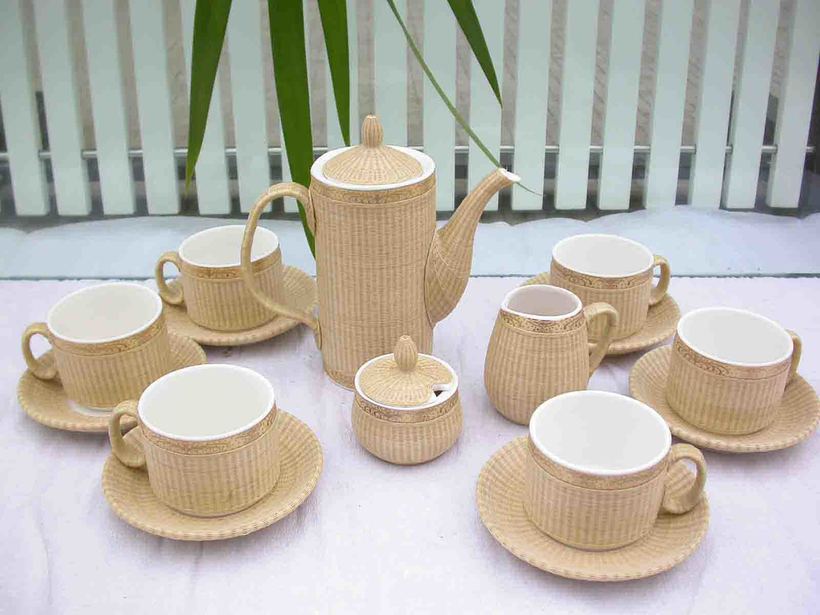 Если вы хотите купить какой-то необычный подарок, то вот вам идея: в последнее время стало модно сочетать фарфор и плетеный бамбук, получаются очень красивые интересные вещи, как, например, этот чайный сервиз на фото ниже.